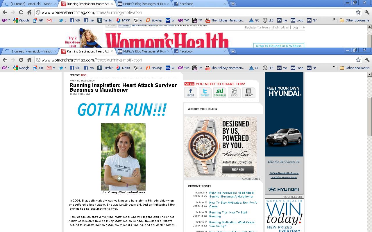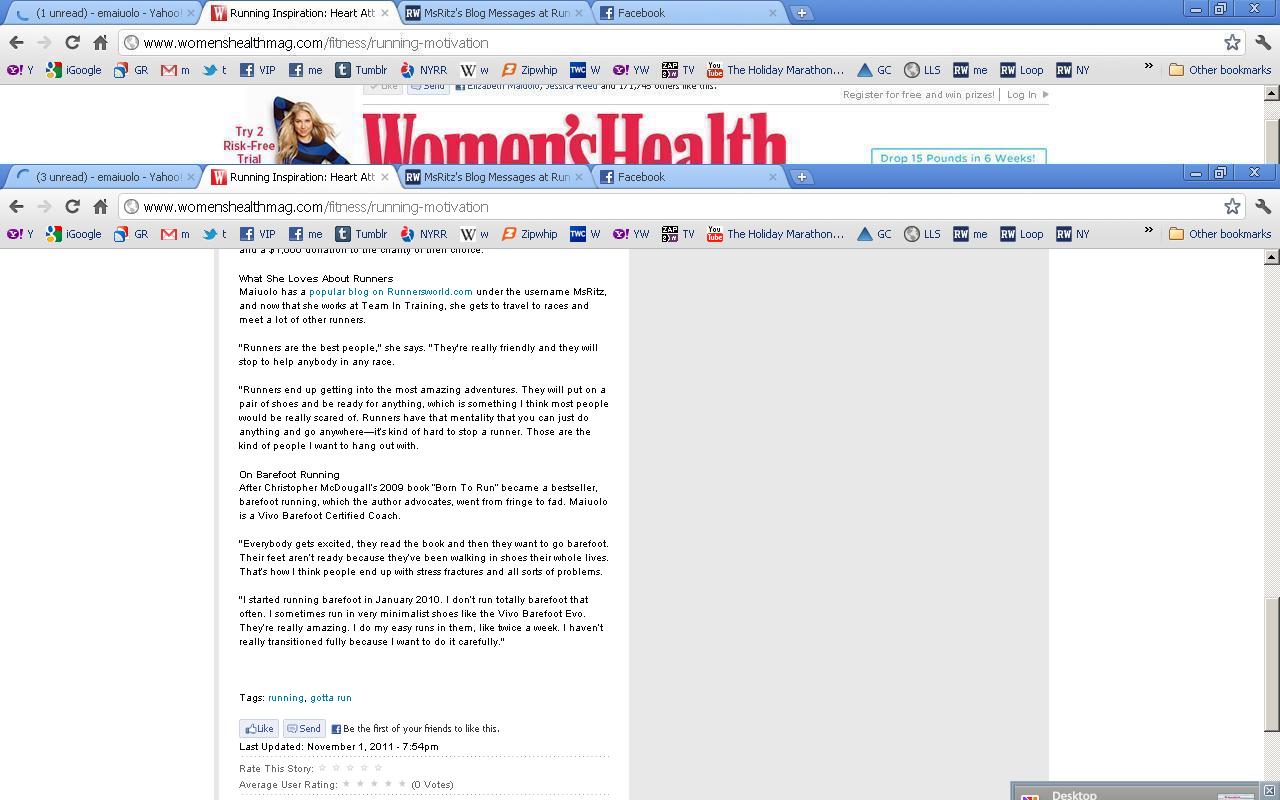 I am in the home page ofΒ Womenβs HealthΒ today!!! (at least forΒ right now). WH belongs to Rodale, just like Runnerβs World and Running Timesβ¦ So when I talked to Susan, who wrote the article, she knew ALL about me, as she used to work at RW!!! Ehem, I was a bit shocked at how much she knew and was super prepared. Small World it is! So I wasnβt surprised when I saw her write up. The fullΒ article is hereΒ if you want to read it.