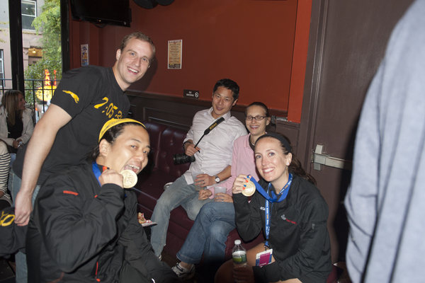 but I had no phone reception in there, so eventually we got up, hugged it out, promised to run again soon together, and headed to my teamβs party, where everyone was wearing some marathon bling, though some of them were showered and smelling nice!
