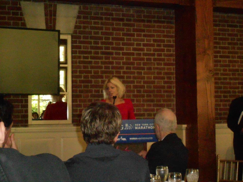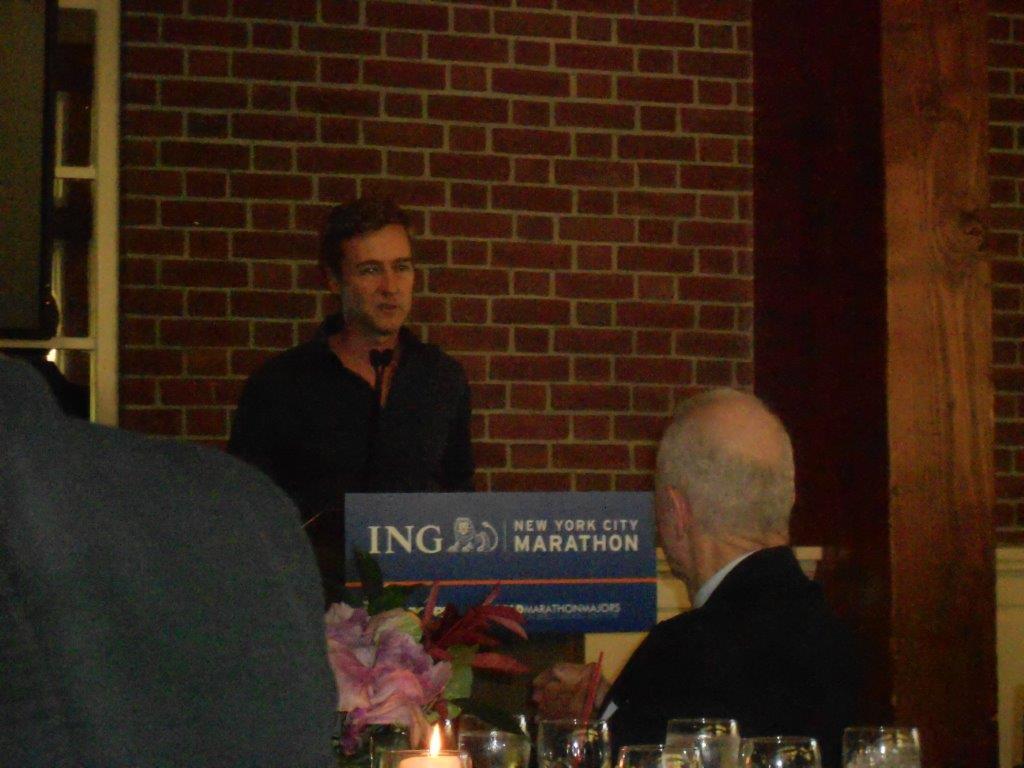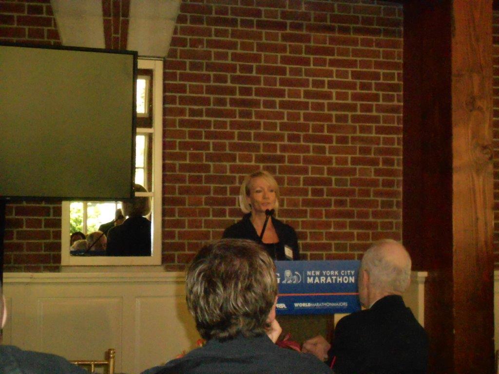 As soon as I got there, I found lots of people I knew. BesidesΒ SalΒ (the Queens runner),Β my boss and one of the managers(love both!!!) were there! Shocker!Β Toby TanserΒ was there, obviously. And lots of people I had met a lunches or races (because it seems like that is all I do!). I think I knew 80% of the room, and after I said all theΒ hellos,Β andΒ how was yesterday?Β I sat, ate a lot of carbs, and was ready to listen!