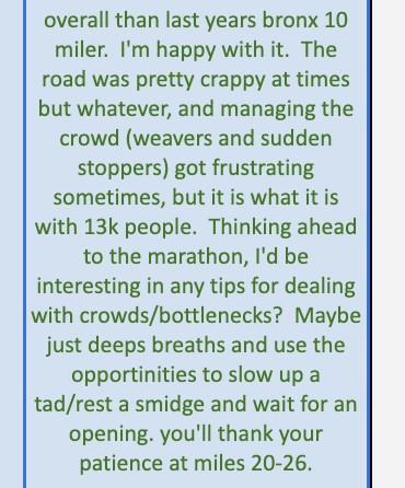 4- potholes and crowds is such great training for any raceβ¦ we have to be in the moment and avoid issues. Racing is all about sorting through obstacles. And the marathon is full of them: crowds, space, potholes, effort, following ppl vs not following someone, water stations, nutrition, hydrationβ¦. we have to learn to be in the moment to sort through any obstacle every second.